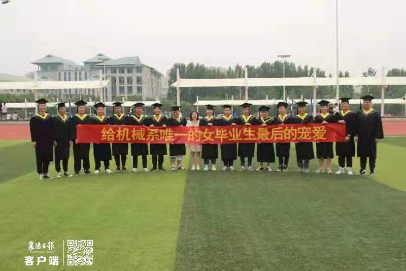 当天,机械系男生们为梁明珠拉出两条横幅:“给机械系唯一的女毕业生最后的宠爱”“男生征服世界 女生统治机械”,宠爱之情溢于言表。男生们充当绿叶与梁明珠在操场、教室等地拍照留影。随后,男生们纷纷拿出小礼物送给梁明珠,祝愿她前程似锦。