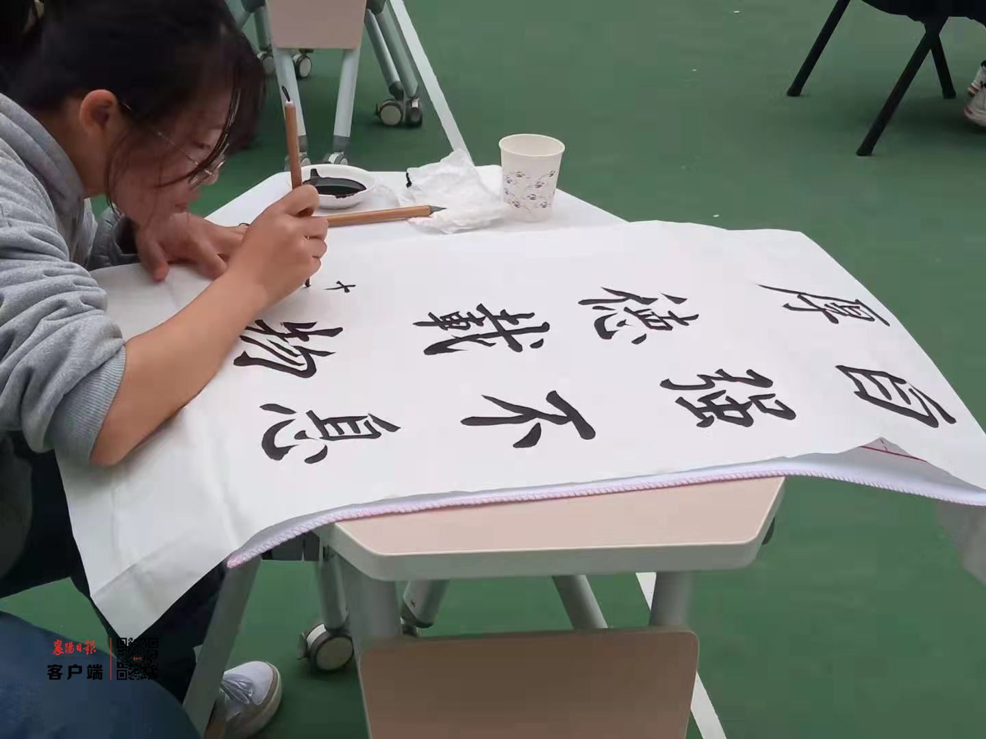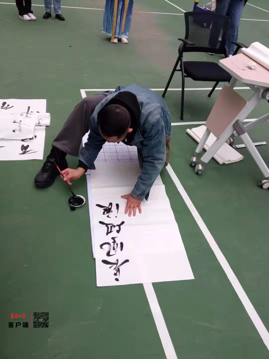 一位选手发现桌上书写不能够发挥出自己的水平,在老师的提议下,他半跪席地书写,笔风豪迈洒脱,评委老师们称赞不已。