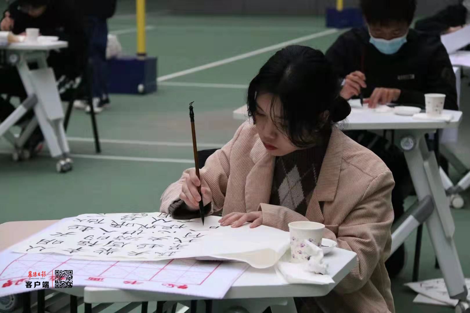 比赛包括毛笔、粉笔、硬笔三个项目。参赛选手们拿起毛笔,在宣纸上徐徐书写。