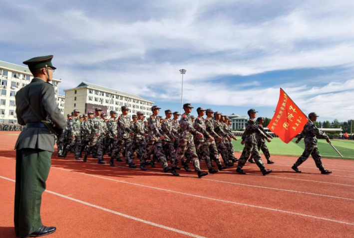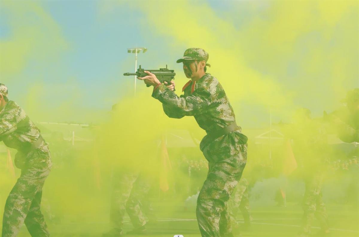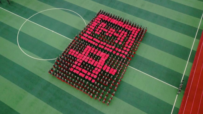 上午9时许,阳光明媚,蓝天白云之下,身着迷彩服的学生方阵成为一道靓丽的风景,迎校旗、分列式等环节依次进行。在表演方阵上场后,旁边的大屏幕呈现航拍画面,学生们举起手中的红色方板,伴随着《万疆》的歌声,摆出倒计时数字、战斗机、“我爱你中国”等造型。