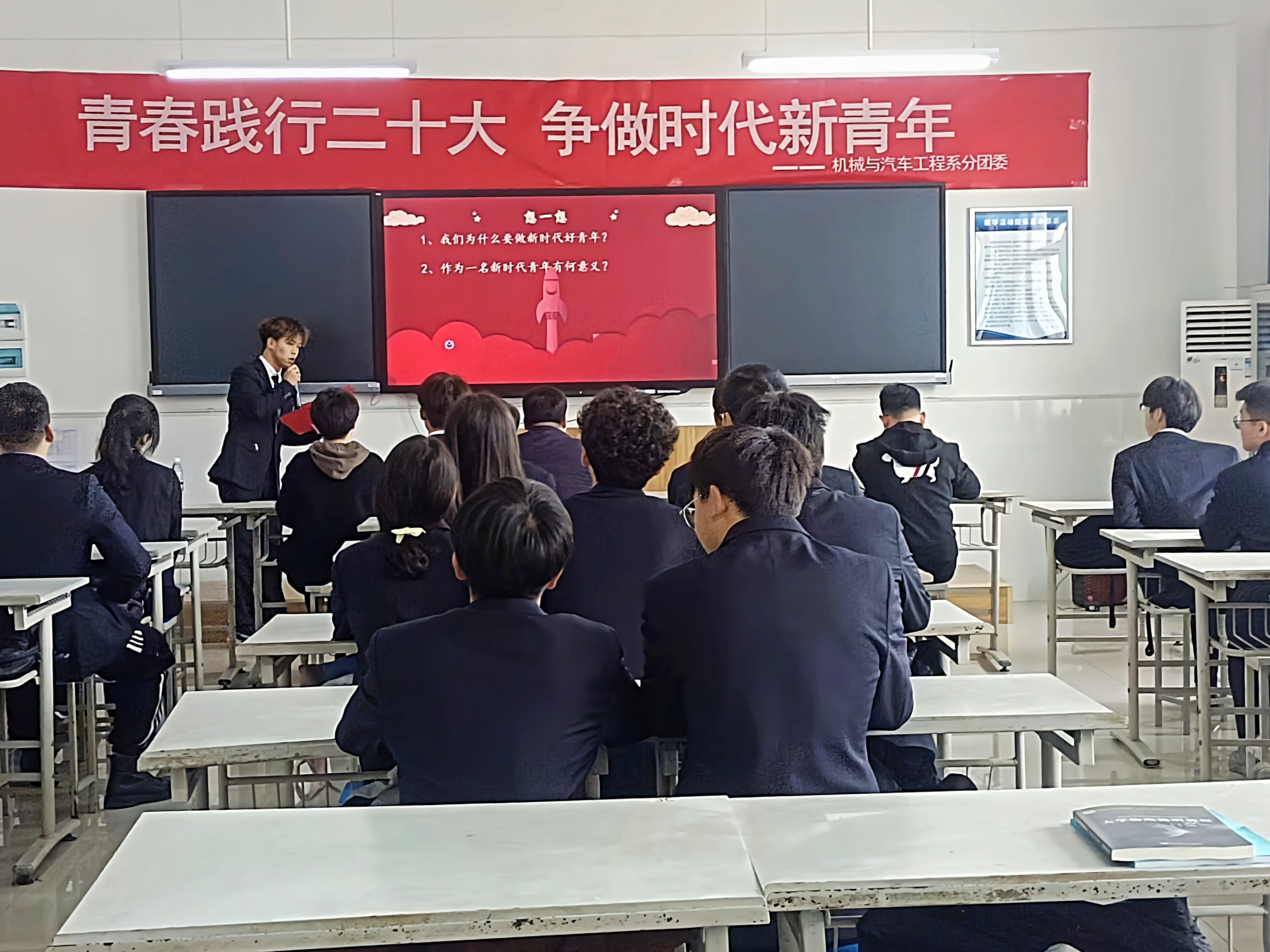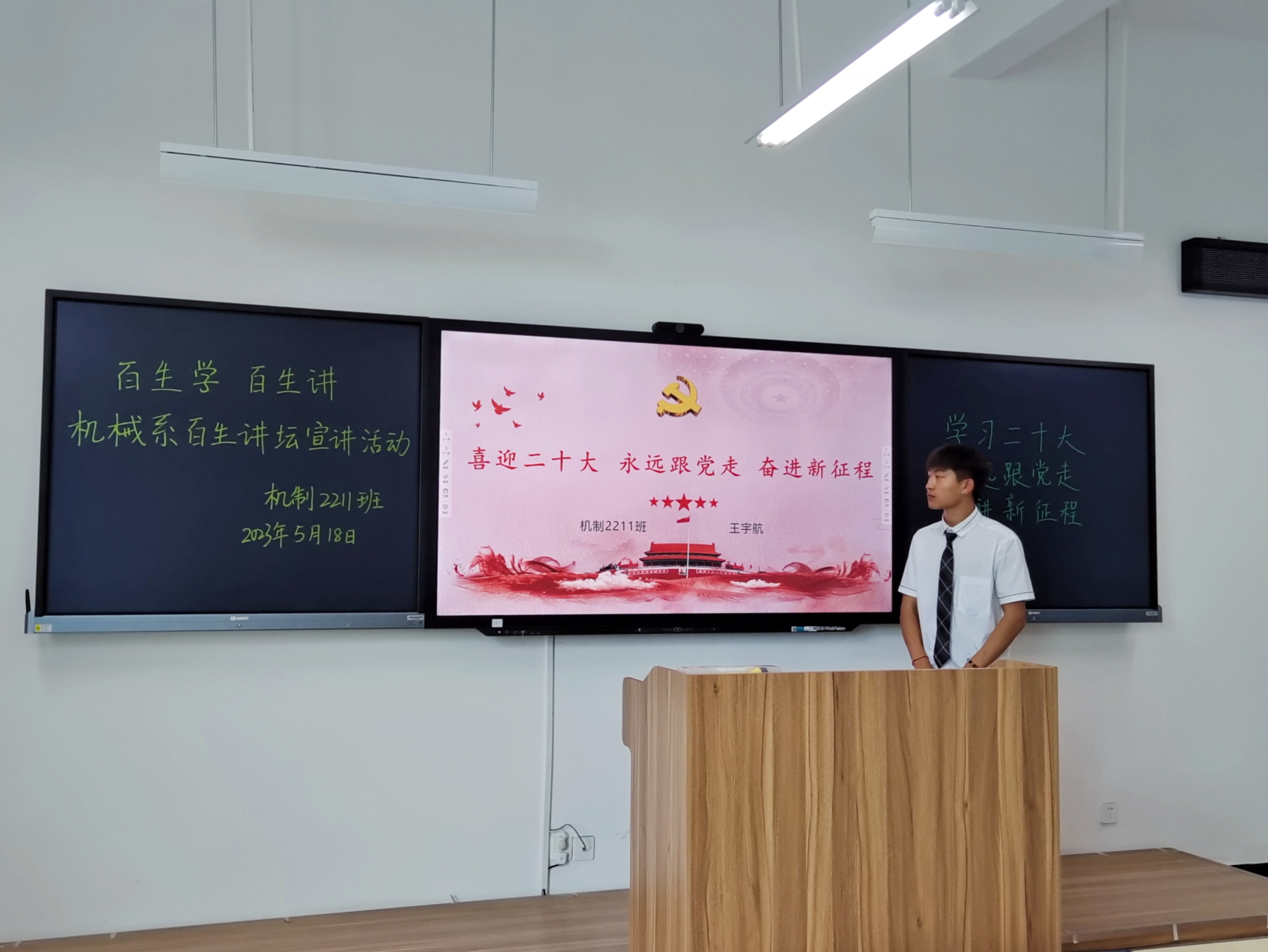 机械系积极践行“百生讲、百生学”系列方针,跟随当代青少年思想教育政策,开展“百生讲坛”系列活动,根据当代青少年所接触的爱国教育思想,将党的二十大精神和思想教育巧妙融合,采用观看微视频和PPT讲解、案例分析等通俗易懂的形式让同学们了解到党的二十大精神对党和人民的重要性。同时也让同学们了解到虽然现在身处盛世,但依旧不负盛世的决心,学党史知团情,提升自我的价值水平修养。