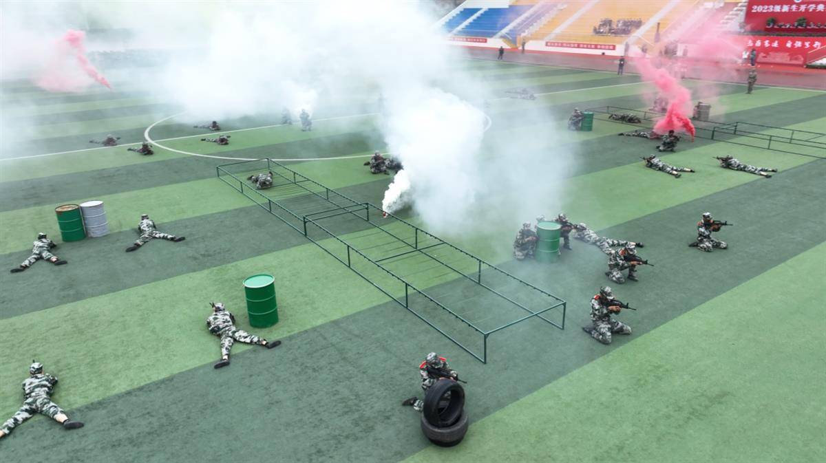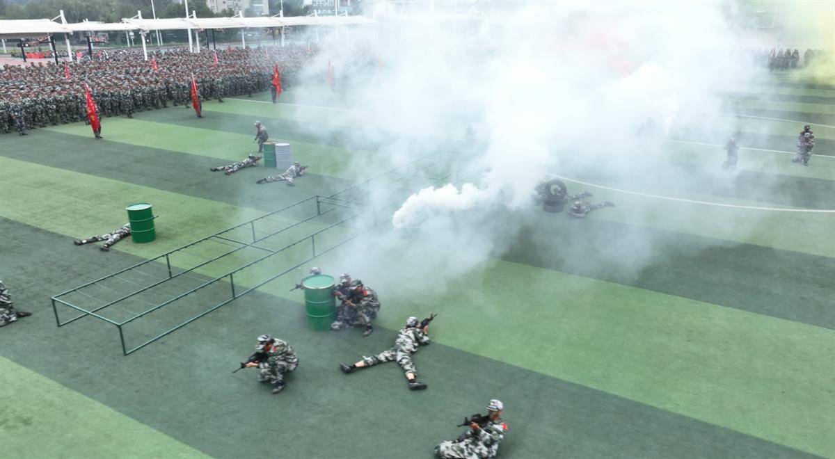 在分列式演练环节,36支新生连队以坚毅的步伐、整齐的队列,展示了良好的精神风貌和优异的训练成果。分列式后的战术演练,操场硝烟弥漫,同学们跪地射击、匍匐前进,展演精彩纷呈。