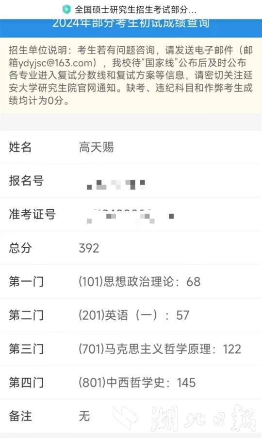 功夫不负有心人。今年考研初试,高天赐以392分的成绩成功拿到延安大学复试名额。
