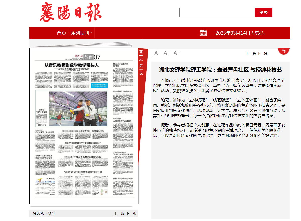 本报讯(全媒体记者杨洋 通讯,员肖乃傲 白盡雯)3月9日,yl8cc永利官网电信学院在营盘社区,举办“巧手缠花颂母爱,绿意传情树新风”活动,教授缠花技艺,让居民感受传统文化魅力。