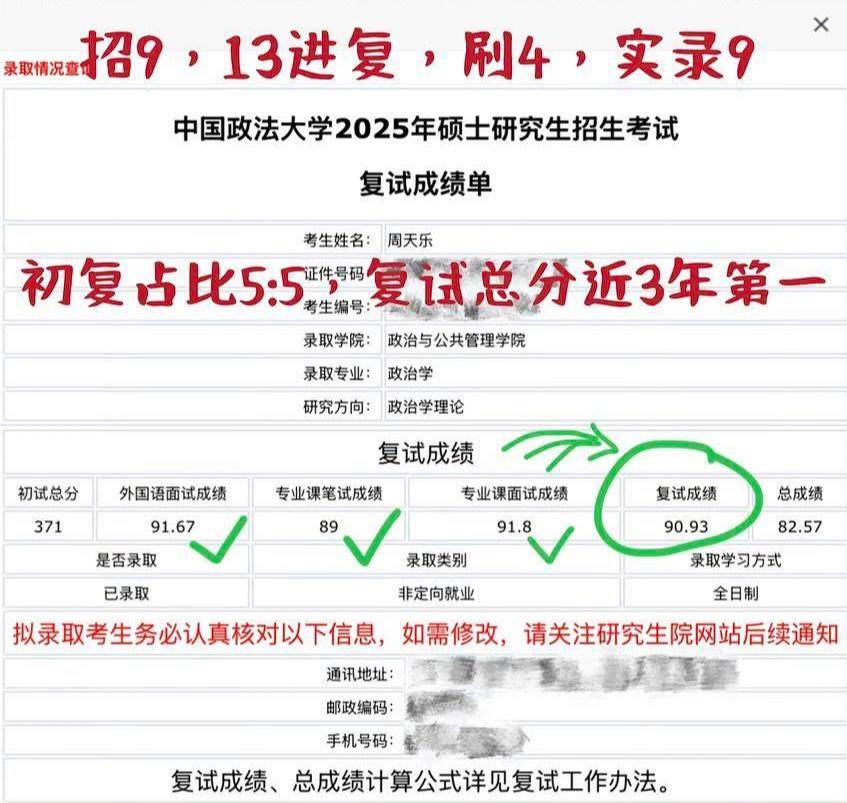 周天乐的努力终于迎来幸运女神的眷顾,他收到了中国政法大学笔试面试的通知,周天乐凭借着沉着冷静、镇定自若的心态和扎实的功底,最终获得中国政法大学该专业近三年复试总分第一的好成绩。